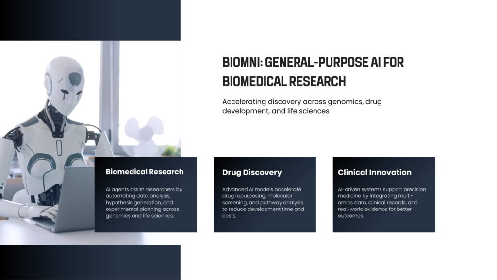Biomni: a general-purpose biomedical AI agent aligns with precision medicine initiatives in pharmaceutical R&D, contract research organizations, and academic consortia focused on therapeutic discovery. Its benchmark performance establishes new standards for agentic AI in life sciences, surpassing single-purpose tools in flexibility and research depth.